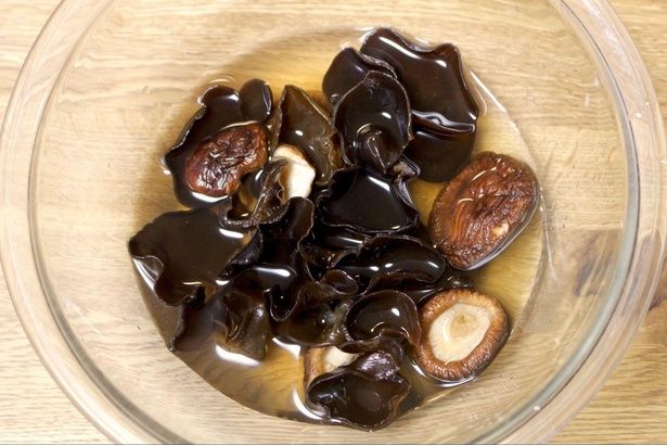 きくらげ、干ししいたけは、うまみが抜けないようにひたひたくらいの水につけ、一晩かけてゆっくり戻すのがポイントだといいます。