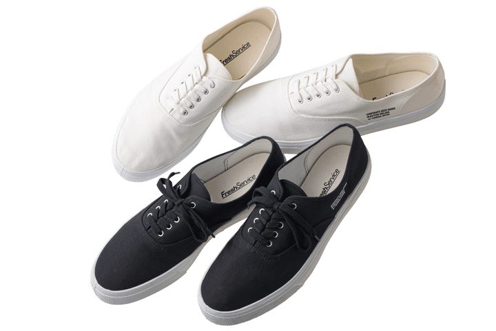福岡県久留米市で120年以上靴作りを行っている老舗ブランド〈アサヒシューズ〉に別注した、オーセンティックなキャンバスデッキシューズ。足幅が広い設計の靴型と独自に開発したラバーインソールを合わせることで、シンプルながらもコンフォートな履き心地に。アッパーにはモデル名や素材を羅列したプリントが施され、〈フレッシュサービス〉らしいアクセントになっている。