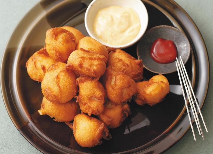 ❷ボウルに【A】を入れて泡立て器で混ぜ、衣を作る。①に衣をつけ、160~170度に熱した油でふんわり揚げて油をきる。器に盛り、2種のソースを添える。