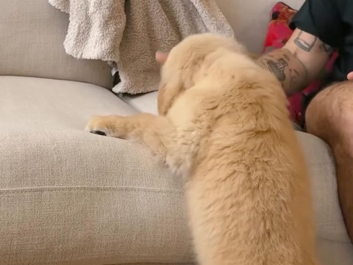 3. あと少しが届かない! それでも飼い主さんの隣に座りたくて挑戦する子犬さん