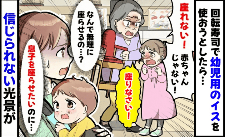 「ちょっと待って!」回転寿司で最後の幼児椅子を持っていかれ…隣の席を見ると信じられない光景が!?