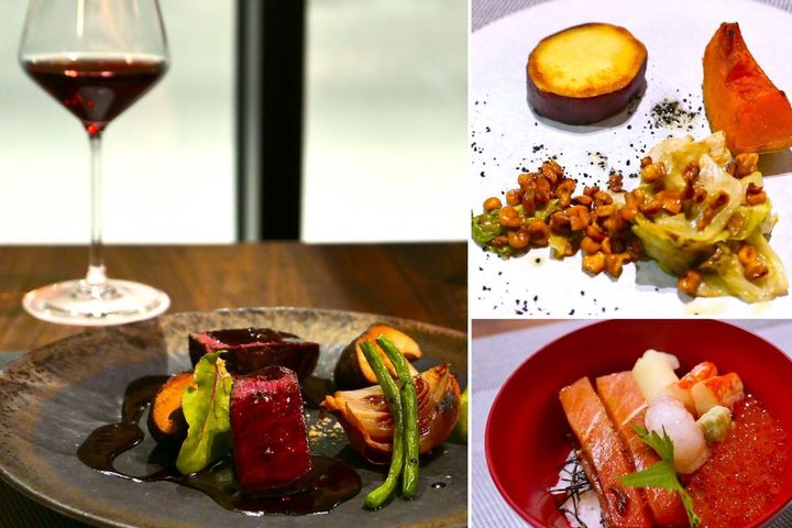 余市の赤ワイン「キャメルファーム ケルナー」2,610円(税込)と相性ぴったりの「【牧】牛ヒレステーキ」、トリュフの風味がアクセントの「【野】焼野菜」、ぷりぷりで鮮度抜群の「【止】海鮮丼」