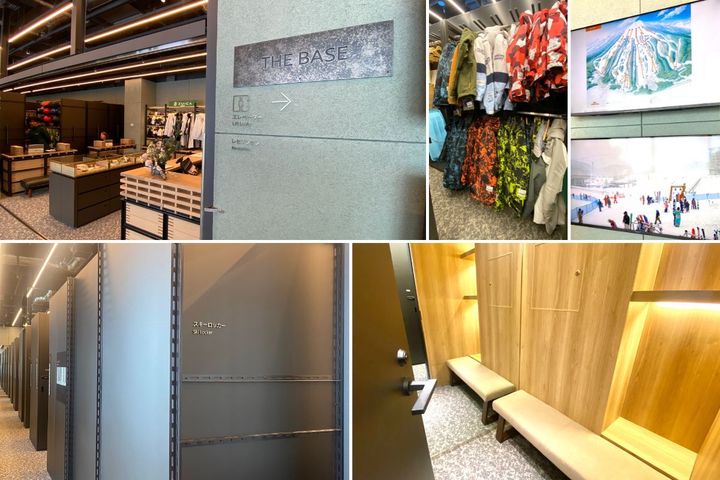 スキーレンタル・スキーロッカーはホテル内「THE BASE」にて。ニセコHANAZONOリゾートのライブカメラ映像やリフト&リゾート営業状況が常時映し出され、広々とした更衣室もあります。