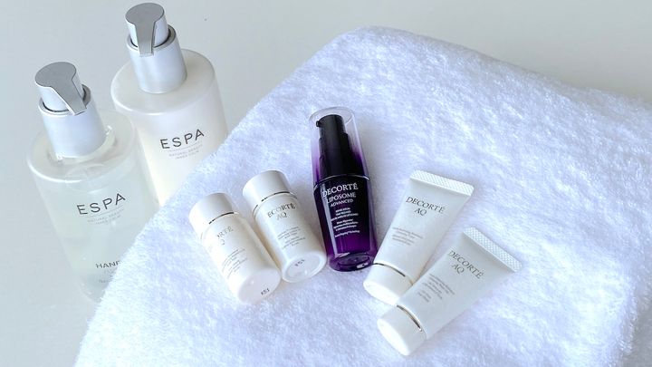 コスメデコルテ AQシリーズ(クレンジング・洗顔フォーム・化粧水・乳液・美容液・コットン)、ESPA(シャンプー・コンディショナー・ボディソープ・ハンドソープ・クレンジングバー・ボディローション)。しっかり厚みのあるふわふわなタオルもうれしい