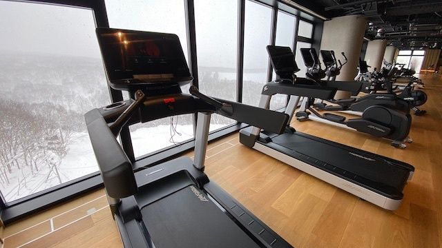 24時間無料で利用できるジムは、大きな窓からニセコ連峰が一望できます。筆者が訪れたとき外は少し吹雪いていましたが、最新マシンのモニターに映った雄大な青空のもと食後の散歩。束の間のウォーキングでしたが、58kcal消費と表示され、気分が上がります。