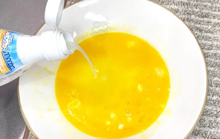 【A】のボウルには、卵1個、希釈用の『カルピス』50㎖、溶かしバター大さじ1杯を入れて、よく混ぜ合わせておきましょう。