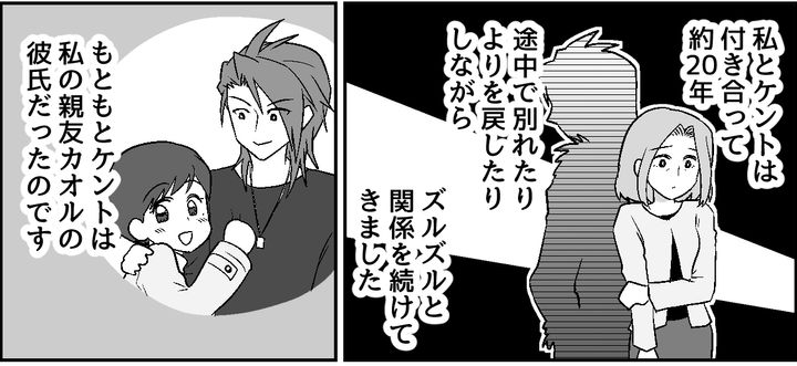 私はエイコ。大学生の頃から付き合っているケントとは、別れたりよりを戻したりしながら20年以上経ちました。40代になり切実に子どもが欲しくなった私は、不妊治療をきっかけに同棲していたケントと婚姻届を出すことにしました。私が結婚を真っ先に報告したいと思ったのは親友のカオルです。私とケントとカオルは学生時代、同じバイト先だったのです。ただケントの元カノでもあるカオルに、私はずっとケントとの付き合いを隠してきました。