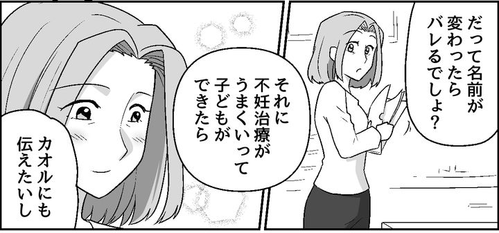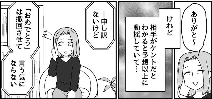40代になってどうしても子どもが欲しいと思った私は、不妊治療をきっかけにケントと結婚することになりました。そしてカオルにはきちんと自分から報告して祝ってもらいたいと思ったのです。しかし私の結婚相手がケントだと知ったカオルは、「おめでとうは撤回させて」と言って電話を切ってしまったのでした。