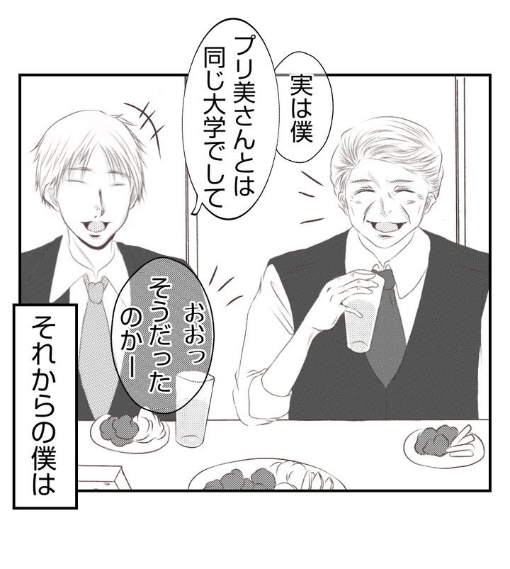 後にプリ美の夫になる彼に酒の席で「娘婿にならないか?」と冗談で誘う。