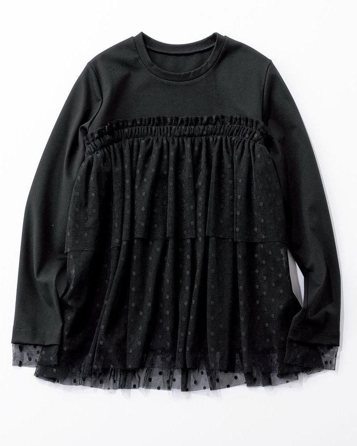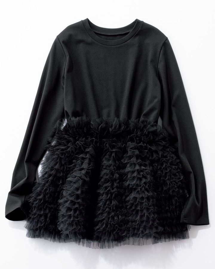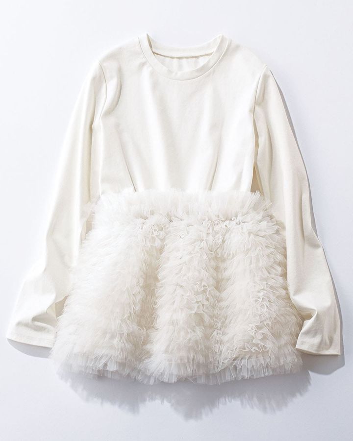 ボリュームが出すぎないように試着を重ね、この細かなフリルを採用しました。バレリーナのチュチュのような可愛さが特徴的なプルオーバーは、色もモノトーンで揃えています。ロングスリーブのTシャツ部分は薄手のポンチ素材を使用しているので体のシルエットを拾いにくいのがおすすめポイント。手洗いが可能です。