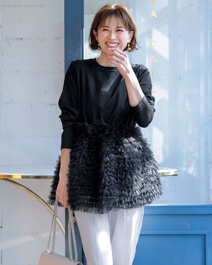 チュールフリルプルオーバー¥17,600(シークレット・トロフィー)パンツ¥17,600(Stola.)バッグ¥188,980(ミチノ・パリ/トゥモローランド)ピアス¥24,420(ベン・アムン/ズットホリック)