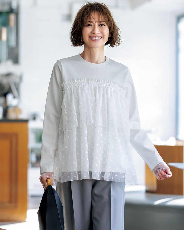 ドットチュールプルオーバー¥16,500(シークレット・トロフィー)パンツ¥17,600(イチエ/シュガー・マトリックス)バッグ¥49,500(オルセット/オルサ)ピアス¥3,850〈ヘンカ〉リング[左手]¥3,900〈soie〉リング[右手]¥13,200〈G.R〉(すべてロードス)