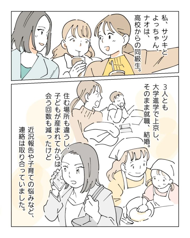 私サツキと、よっちゃん、ナオは高校からの同級生です。3人とも大学進学を機に上京し、そのまま東京で就職、結婚。私は小3の息子、よっちゃんは5歳の娘、ナオは2歳と0歳の2人の子どものママとなり、今は絶賛子育て中です。同じ東京都ですが住む場所も違うし、子どもが産まれてからは会う回数も減りましたが、今でも近況報告や子育ての悩みを相談したりと3人で連絡は取り合っていました。