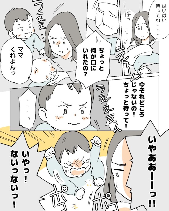 ナオさんが洗濯物を取り込んでいると、上の子がお絵描きをしたいと言い出しました。「はいはい待ってね・・」とナオさんが部屋に戻ると、下の子の泣き声に気づき慌てて駆け寄ります。「ちょっと、何か口にいれたの?」と慌てるナオさんに、まだ状況を理解できない上の子が「ママ、くれよんっ」と催促。焦っているナオさんは「今それどころじゃないの!ちょっと待って!」と言って下の子の口の中を見ていると、すぐに取り合ってもらえないことに上の子が怒り出し「いやああーーっ!!いやっ!ないっないっ!」と泣きだしました。
