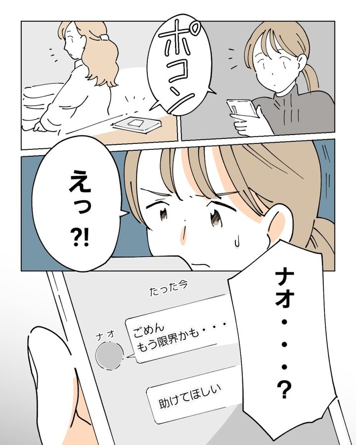 ある日、私とよっちゃんとナオのグループチャットに久しぶりにメッセージが届きました。見ると、ナオからの「ごめん。もう限界かも・・。助けてほしい」という切羽詰まったメッセージで「えっ?!ナオ・・?」と私はビックリ。しっかり者のナオのことだから2人目が産まれても大丈夫だろうと思っていた私は、突然のSOSにとても驚きました。