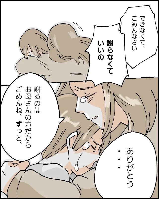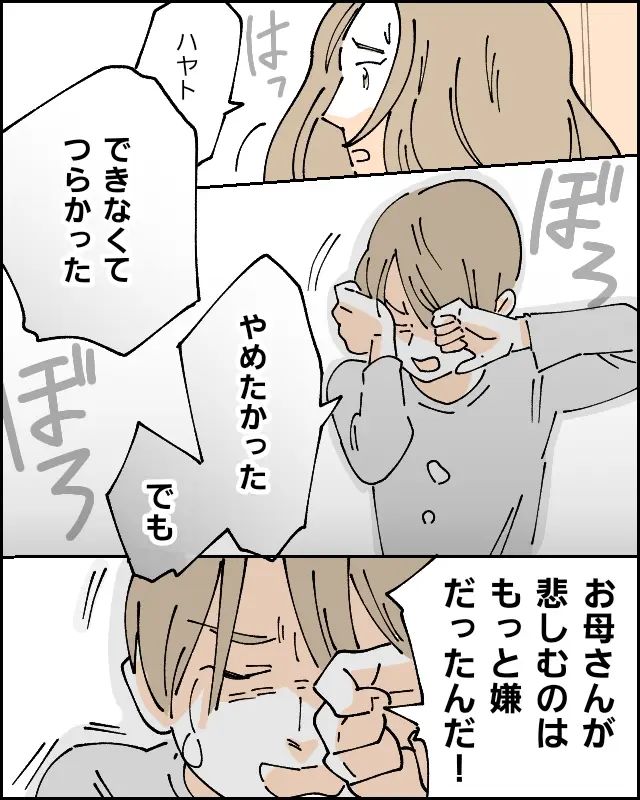 「できなくてごめんなさい」と泣きじゃくるハヤトを抱きしめて「謝らなくていいの、謝るのはお母さんの方だから。ごめんね、ずっと、ありがとう」と伝えました。