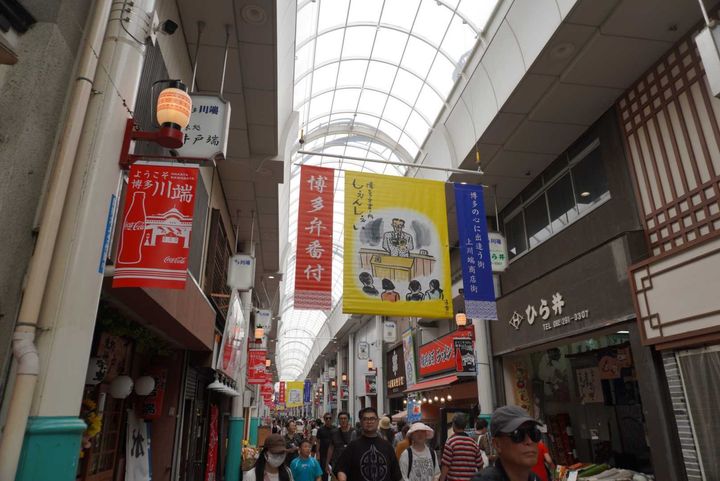 櫛田神社を出発し、徒歩で川端通商店街へ。博多で最初に栄えた商業の町で、なんと130年以上の歴史があるそうだ。予約していたお昼ご飯までの時間には少し早かったため、ここで街ブラをすることに。