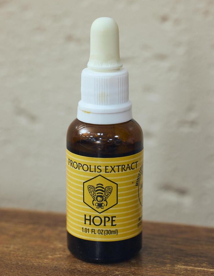 25年以上、愛飲しているプロポリス液。ミツバチが巣を守るために作る天然の防御物質で、抗菌作用や抗酸化作用などがあるとされる。