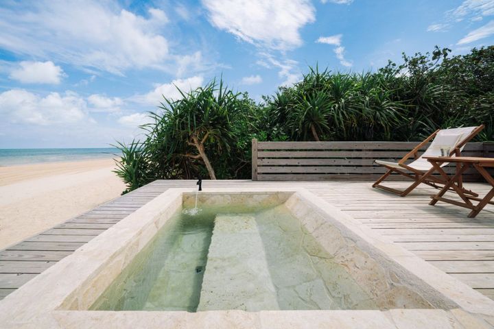 バレルサウナで温まった後は、小浜島の自然に馴染む「琉球石灰岩」を使用した水風呂へ。水温16~18℃に設定された水風呂には背もたれがあり、目の前の景色をゆっくりと満喫できます。
