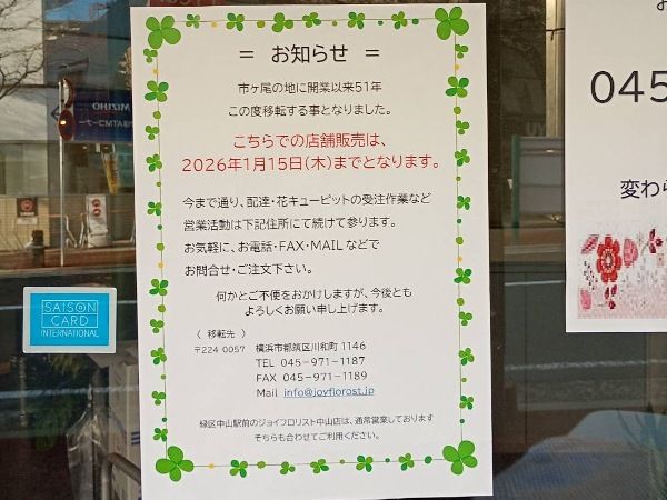 張り紙の冒頭には「市が尾の地に開業以来51年」 長らく愛されたお店だったようです。 お店の前を通ると、いつもきれいなお花や観葉植物が取り揃えられていて、気持ちが晴れやかになったものです。