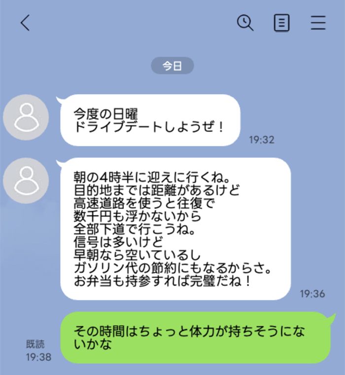でも、遠出デートで、相手の睡眠時間や快適さよりも「数百円、数千円を浮かすこと」を最優先にする彼の価値観に、どうしても震えてしまいました。