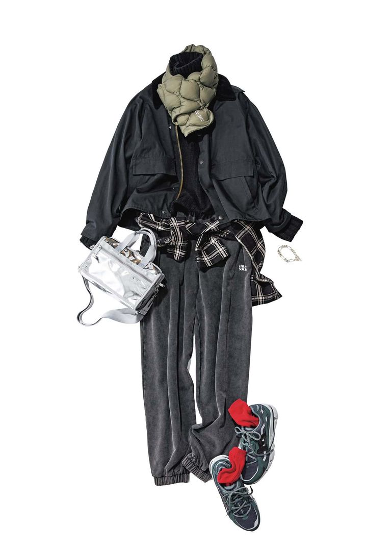 ダウンマフラー¥7,700(エフシーイー® × タイオン/F/CE. Flagship Store Tokyo)ハンティングジャケット¥47,300(バブアー × フリークス ストア/フリークス ストア 渋谷)ニット¥28,000(バナナ・リパブリック)シャツ¥55,000(プラームス フォー コンテ/コンテ 青山店)スウェットパンツ¥27,500(ザ ニュー ソサエティ/THIRD MAGAZINE)バッグ¥24,200(レスポートサック/レスポートサック カスタマーサービス)スニーカー¥19,800(カルフ/シードコーポレーション)ソックス¥880(靴下屋/タビオ)ブレスレット¥18,700(アドラル/ZUTTOHOLIC)