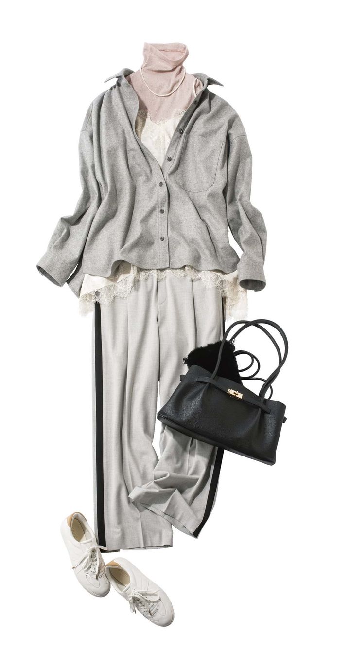 ウールライクシャツ¥7,700 ラメタートル¥4,400 レースサテンキャミソール¥6,600 ラインワイドパンツ¥8,250 スニーカー¥9,350 バッグ¥8,250 ファーバッグ¥4,620 パール付きシュシュ¥2,750 (すべてエルーラ/アダストリア)パールネックレス、ピアス(ともに参考商品)