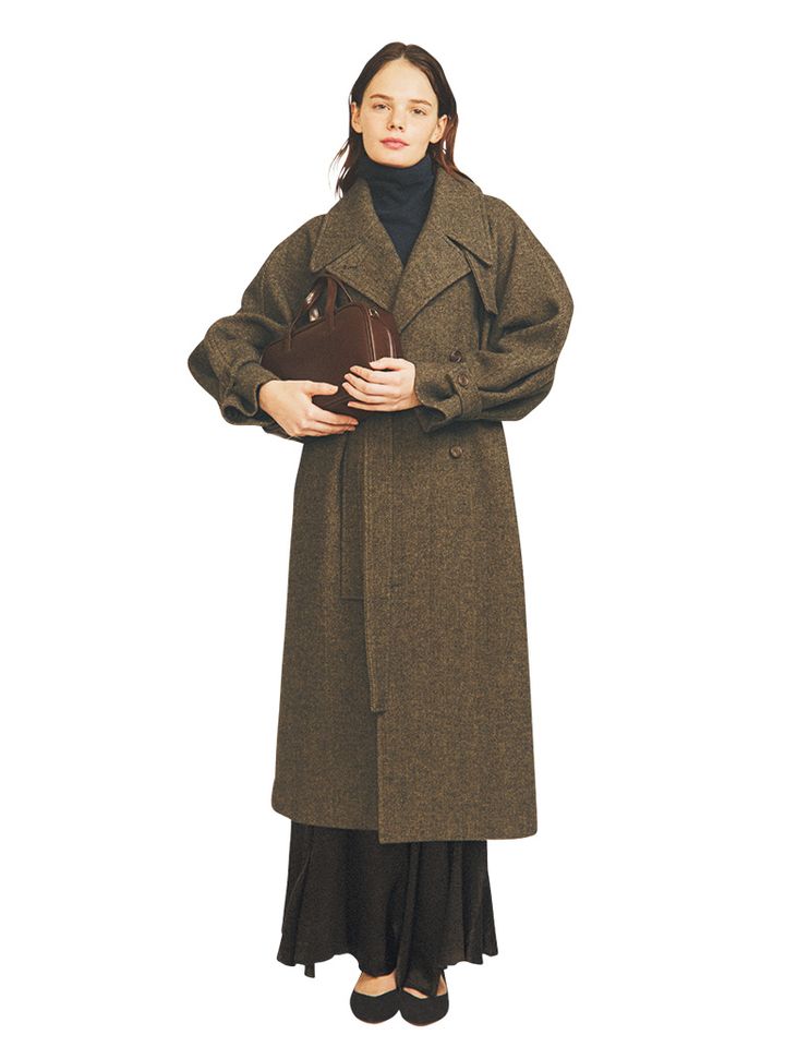 コシのあるツイード生地がレトロな面持ちを加速させるロングコート。構築的にふくらむスリーブ、存在感のあるビックカラーで、シンプルだけどもの足りなさのない風格のある佇まいに。着るだけで装いに深みが生まれる濃淡のあるブラウンの色みもポイント。付属のベルトをしぼればウエストマークも可能。