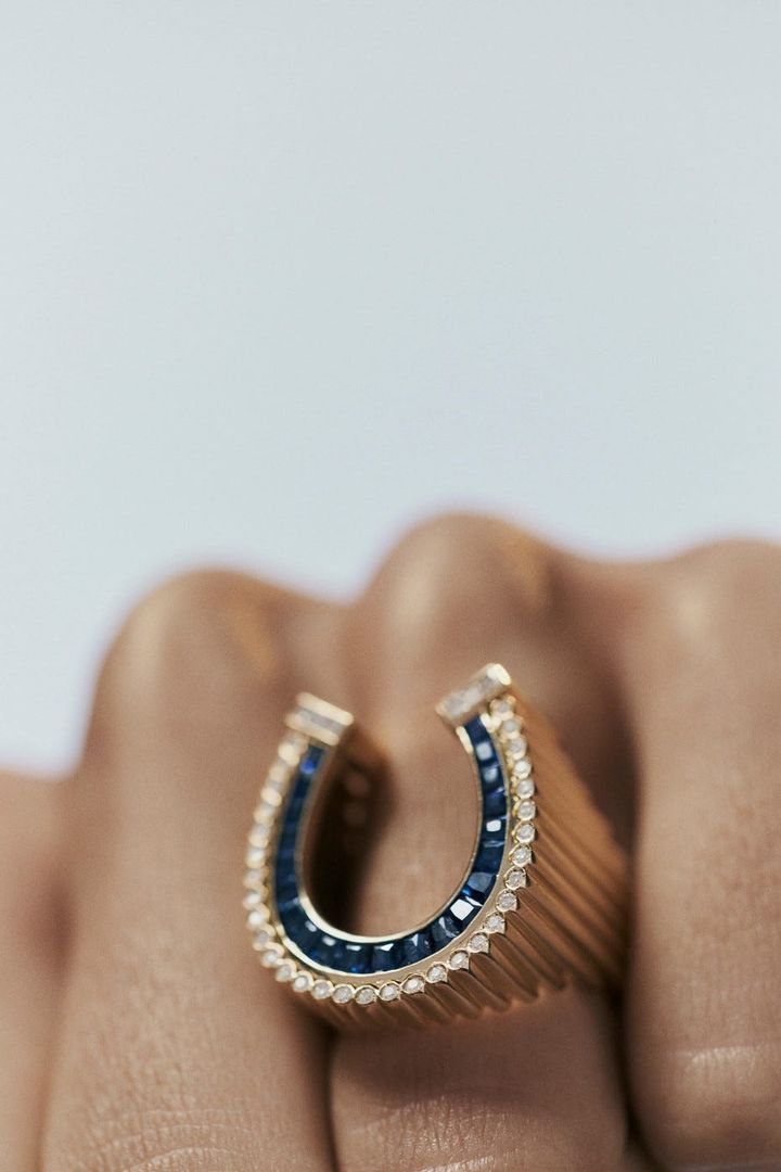 幸運を呼ぶホースシューモチーフのリング。ブルーサファイアとダイヤモンドが端正に並んで。リング「ホースシュー」(YG×ダイヤモンド×サファイア)¥2,970,000 <strong>Marie Lichtenberg</strong> Courtesy of Marie Lichtenberg
