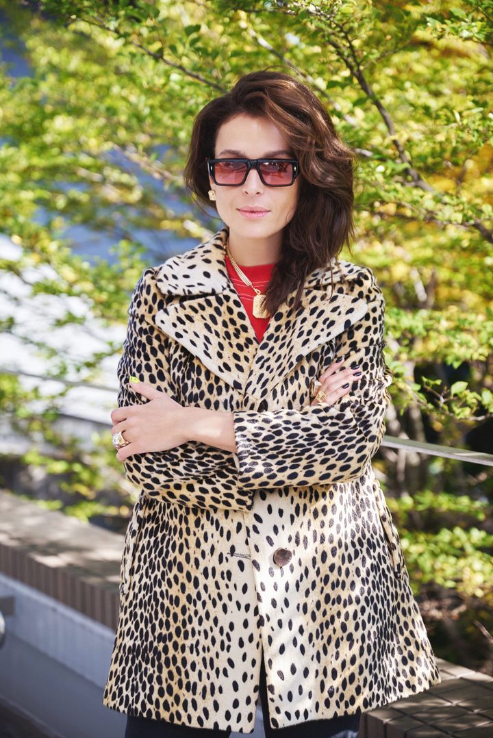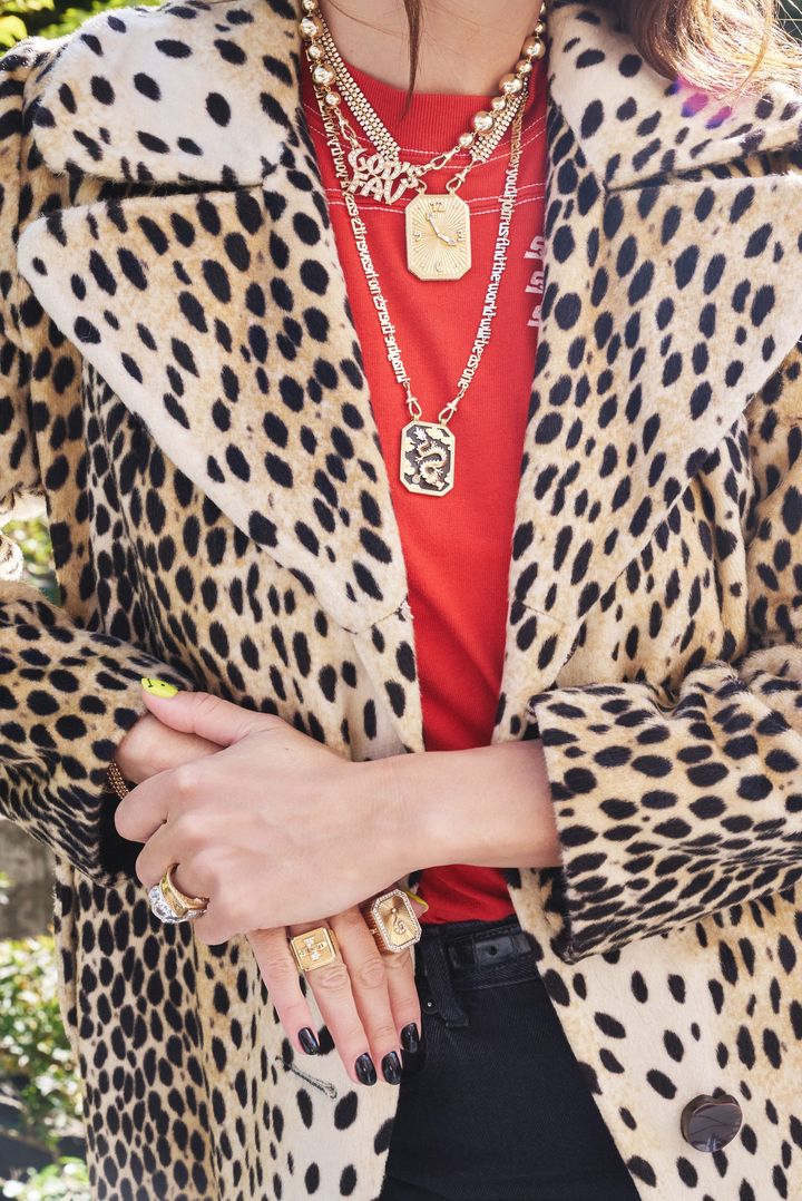 赤のプリントロングTシャツにレオパード柄コートを羽織って、ストリート×エレガンスのミックススタイルで取材に応じたマリー。気になるジュエリーコーデをチェック!