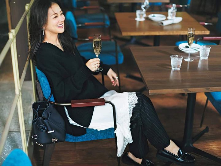 ニット¥49,500(LE PHIL/LE PHIL NEWoMan 新宿店)チュニック¥28,600(ガリャルダガランテ/ガリャルダガランテ 青山店)パンツ¥44,000(エストネーション)バッグ¥51,700(ヴァジック/ヴァジックジャパン)ローファー¥48,400(カステラーノ/フラッパーズ)ピアス¥28,600〈Raza〉リング[右手]¥19,800〈CAKI〉(ともにロードス)チョーカー¥41,140〈エムシー・スタジオ〉リング[左手]¥18,920〈バルブス〉(ともにズットホリック)