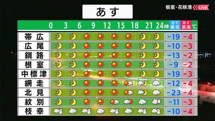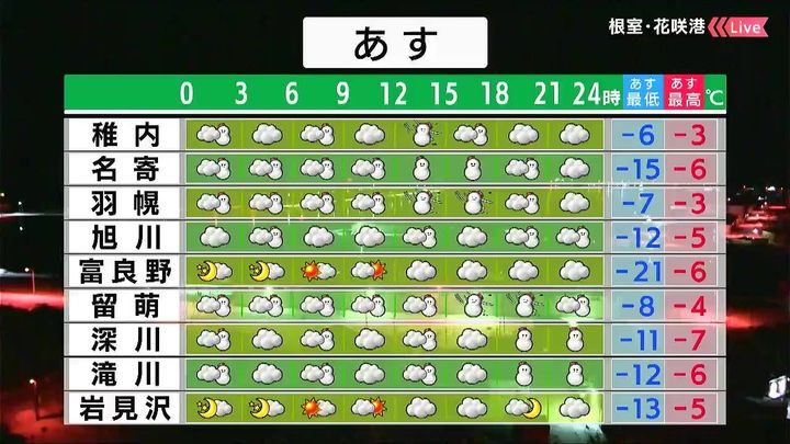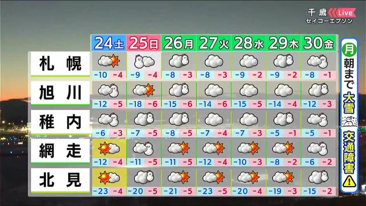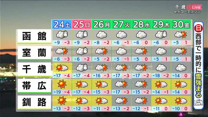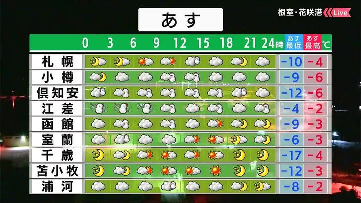 札幌は昼頃に雪がちらつく程度で日が差します。倶知安や江差はあす24日一日で5~10センチの雪が降るでしょう。千歳は晴れて、朝は‐17度まで冷え込みます。