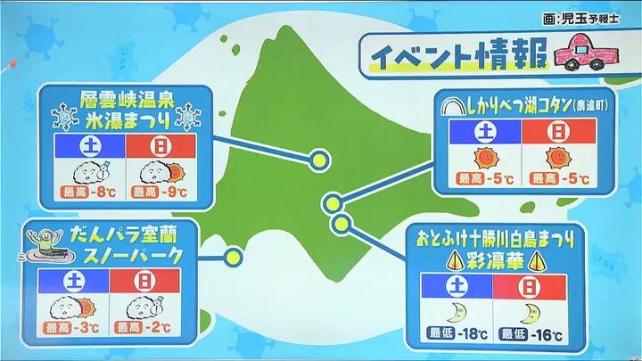 だんパラ室蘭スノーパークではチューブ滑りや雪遊びなどができます。氷のライトアップが幻想的な層雲峡温泉氷瀑まつりもあす24日からです。湖の上に村ができ、アイスバーや露天風呂も楽しめる「しかりべつ湖コタン」。夜のみ開催される、何百個もある三角錐のオブジェが音に合わせて光り輝く「彩凛華」。