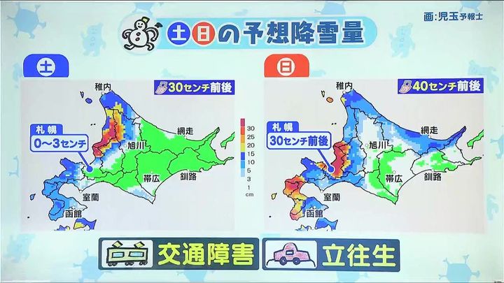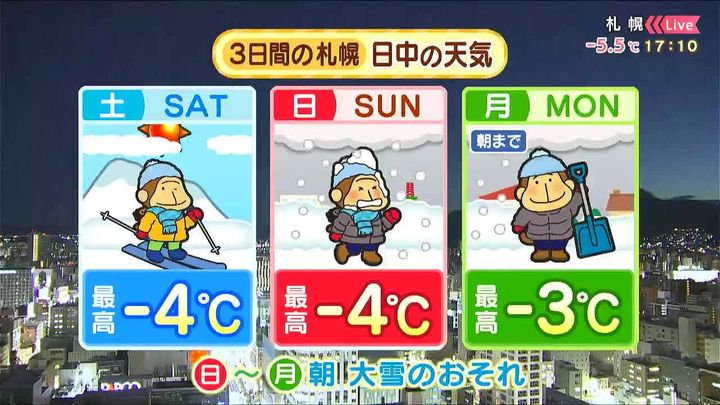 日曜は札幌や小樽で再び大雪のおそれがあります。月曜朝も時間にゆとりを持って出かけましょう。月曜の日中以降は雪はおさまりますが、寒さは続きます。