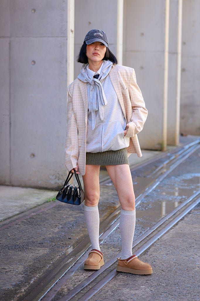 「アグ」を10代の頃に愛用していたという人も多いはず。だからこそ、あえて学生ムードを楽しんでみては? ニーハイソックスやニットのミニスカート、ブレザー、フーディ、そしてベースボールキャップ(ロゴ入りならなお良し)を合わせれば、今っぽいプレッピーな雰囲気が完成する。