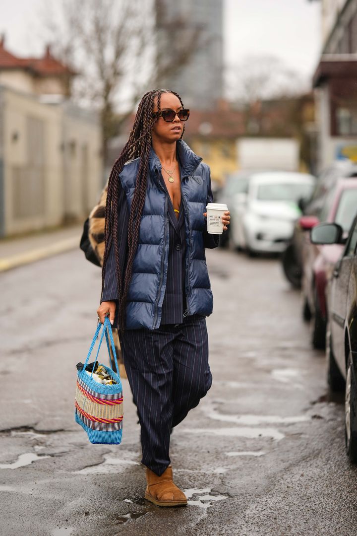 オフィスに「アグ」なんてありえない? そんな思い込みを捨てて、ピンストライプのセットアップスーツに合わせてみて。意外なほどスマートでエッジィな表情を見せてくれる。もちろん、洗練度で言えばクラシックな黒パンプスには敵わないし、ドレスコードが厳しい職場の場合はNGかもしれないけれど、その快適さは何物にも代えがたい。たとえ通勤時間だけの楽しみだとしても、試してみる価値はある。
