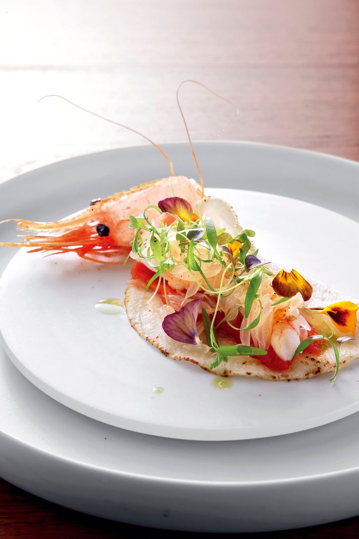 冬に旨みを増すぼたん海老のガーリックオイルソテーは、海老の旨みを引き出した前菜。相性のいい聖護院蕪やパプリカ、文旦などが彩り豊かに添えられます。自家製パンで挟んだ蔵尾ポークの角煮カツサンドは、食べ応えある夜のコースのスペシャリテです。