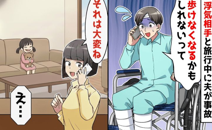 夫「オレ、歩けなくなるかも…」浮気相手と旅行中に事故遭い大ケガ。それは大変…でも♡家族を裏切った代償は
