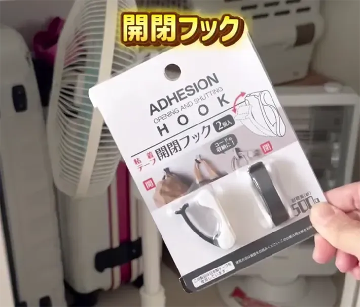 また、『粘着テープ 開閉フック2個入り』はコード以外にも使えます。
