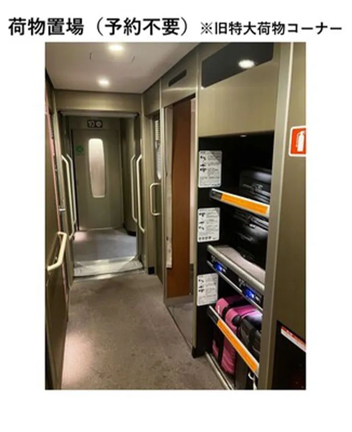 また、特大荷物スペースとは別に、対象座席の最寄りデッキ(洗面所横)には、予約不要で利用できる荷物置場も設置されているようです。