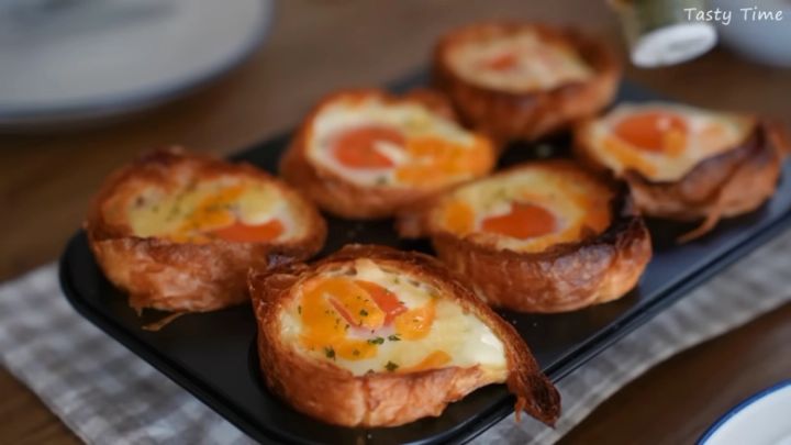 Tasty Timeさんは、ほんのり甘みのあるクロワッサンをおかず系にアレンジ。クロワッサンを輪切りにし、その面の部分をコップでつぶして土台を作ります。その中にチーズやベーコン、卵を入れて、こんがりと焼けば完成!サクサクの生地とにトロッと溶けたチーズ、卵のコクが合わさって、満足感のある一品になりますよ。甘い系だけでなくおかず系アレンジもしやすいので、食事パンとしても幅広く活躍してくれます。