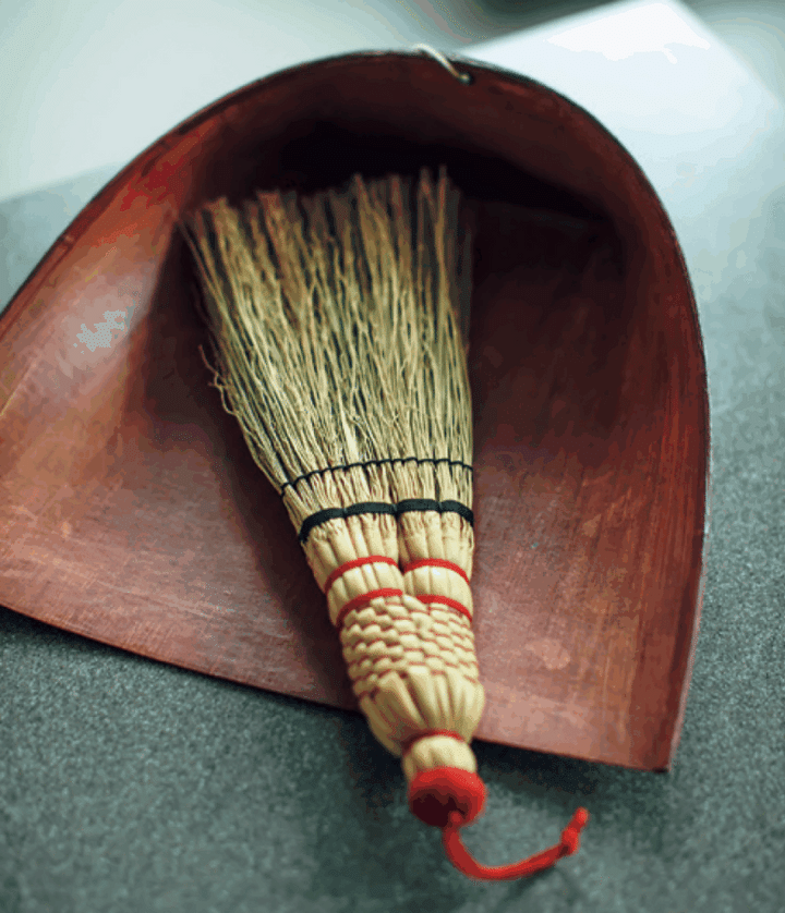 棕櫚の手ほうきと柿渋塗装を施した紙のちりとりで棚や机の上をパパッと掃き掃除。