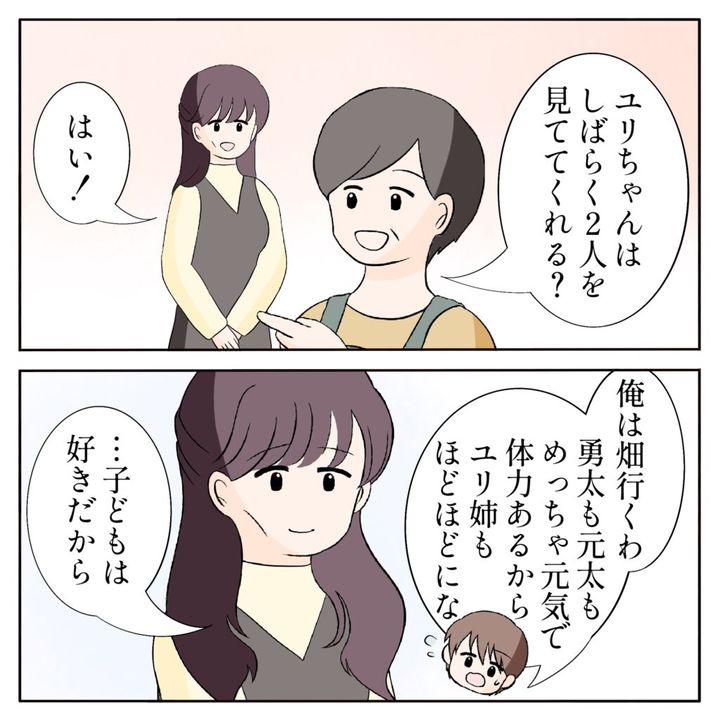 その後、「ユリちゃんはしばらく2人を見ててくれる?」母さんにそう言われ「はい!」と返事をするユリ姉に、「俺は畑行くわ。勇太も元太もめっちゃ元気で体力あるから、ユリ姉もほどほどにな」俺がそう言うと、「・・子どもは好きだから」とユリ姉が静かに言いました。