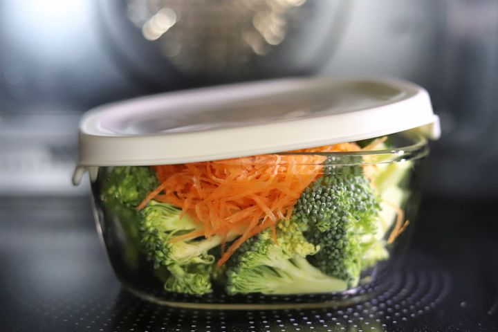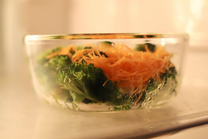 3. ふた(もしくはラップ)を軽くかけ、600Wの電子レンジで3分30秒加熱する。