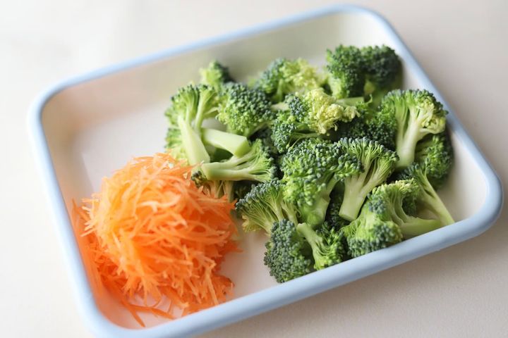 1. ブロッコリーは小房に切り分け、にんじんはスライサーで細いせん切りにする。