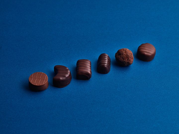 チョコレートは、フレーバーごとに形状や味わいも多彩。左から、カプチーノの香りがふわりと立ち上がる、風味豊かなヘーゼルナッツプラリネを合わせた「パレ・カプチーノ」、房取りしたオレンジをかたどった、ほんのり甘酸っぱくフルーティーなガナッシュの「マンダリン」。砕いたアーモンドを練り込んだジャンドゥーヤに、ココナツの甘い香りがやさしく広がる「アンティル」、ダークガナッシュにライムを加え、清涼感のある酸味がカカオの香りをキリッと引き締める「シトロン・ヴェール」も印象的だ。
