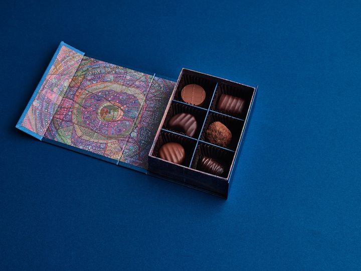 作品をまとったボックスの中には、6種のフレーバーのチョコレートを詰め合わせ。アートとチョコレートが重なり合うことで、贈る側も受け取る側も、作品と向き合う体験そのものを楽しめる仕立てだ。