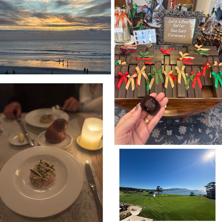 (右上)クラフトチョコレート専門店「ルラズチョコレート」で、シーソルト×キャラメルを。甘じょっぱさがクセになるおいしさ。(右下) 世界屈指の絶景ルート、17マイル・ドライブへ。名門ペブルビーチの空気感は、ただ車を走らせるだけでも贅沢!