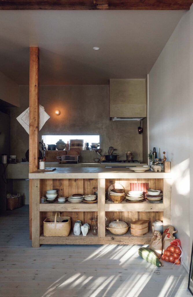 「有機的というのでしょうか、食を扱う場所なので、その感じがいいなと思って。作業台兼食器棚も造作してもらいました。整理整頓がさほど得意ではないので、収納はざっくり