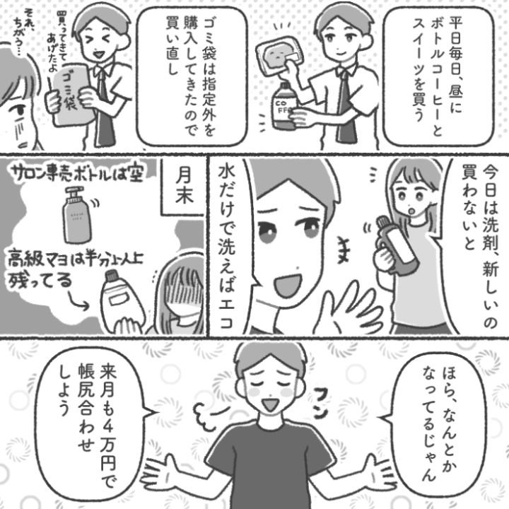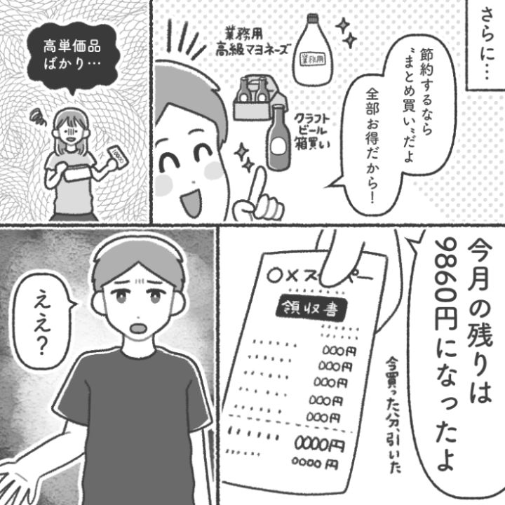 衝撃のエピソードを漫画化!今回は生活費は月4万でやりくりしろと言うくせに毎日デザートやコーヒーを買ったり、単価が高い食品ばかり買う世間知らずな夫のお話をご紹介します。